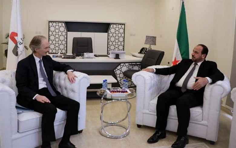 التقى ليلة امس وفد من هيئة التفاوض برئاسة د. نصر الحريري مع السيد غير بيدرسون مبعوث الامين العام للامم المتحدة الى سوريا. دار الحديث حول نتائج زيارة بيدرسون الاخيرة الى دمشق. ولقائه وليد المعلم هناك، كما ركز وفد الهيئة اثناء الحديث على الوضع الميداني في شمال غرب سوريا, وضرورة وقف اطلاق النار فيها كلازمة اساسية لعملية سياسية تنوي الامم المتحدة استئنافها فيما يخص القضية السورية; والتي ما يزال نظام الاسد يتهرب منها بعد ان بحثها بيدرسون امس الاول معه.