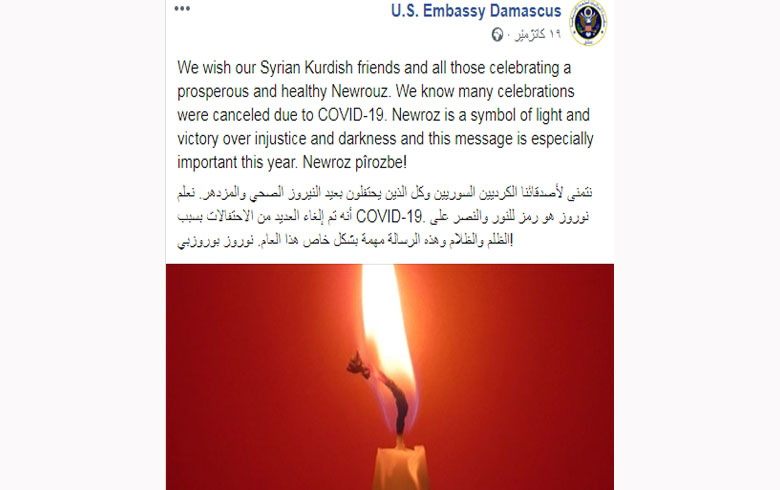 PDK-S: السفارة الأمريكية في دمشق هنئت الشعب الكوردي في سوريا بمناسبة عيد نوروز القومي، الجمعة 20 آذار /مارس 2020.