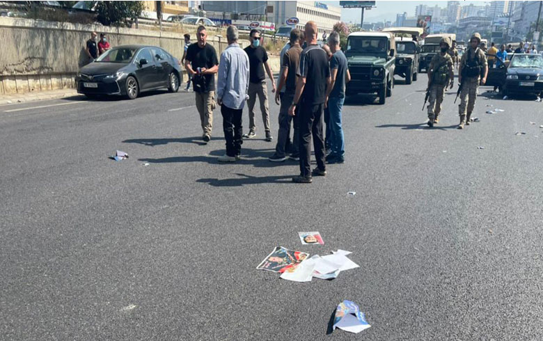شبان لبنانيون يعترضون موكب لشبيحة النظام الذين كانوا متجهين نحو سفارة النظام السوري للمشاركة في الانتخابات