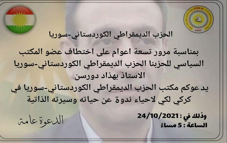 الحزب الديمقراطي الكوردستاني - سوريا PDK-S يدعو للمشاركة بالندوة في مكتب الحزب ببلدة كركي لكي بمناسبة مرور تسعة أعوام على اختطاف بهزاد_دورسن، عضو المكتب السياسي للحزب الديمقراطي الكوردستاني – سوريا